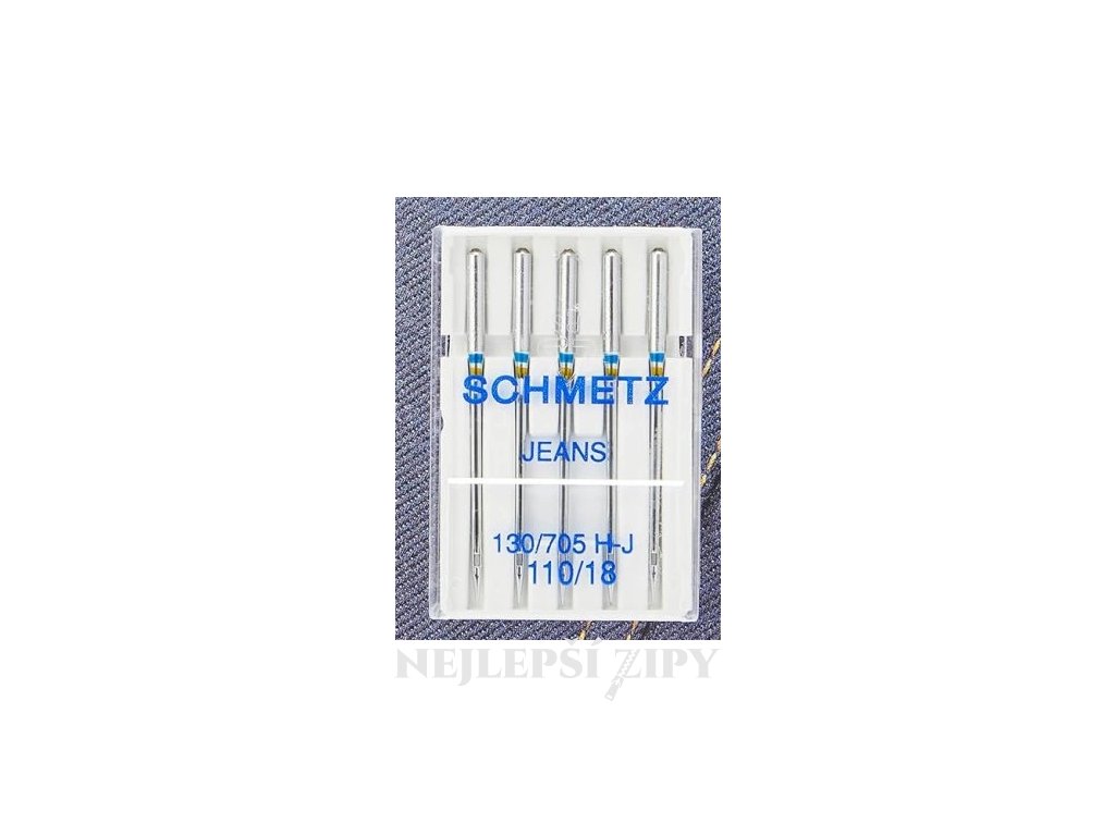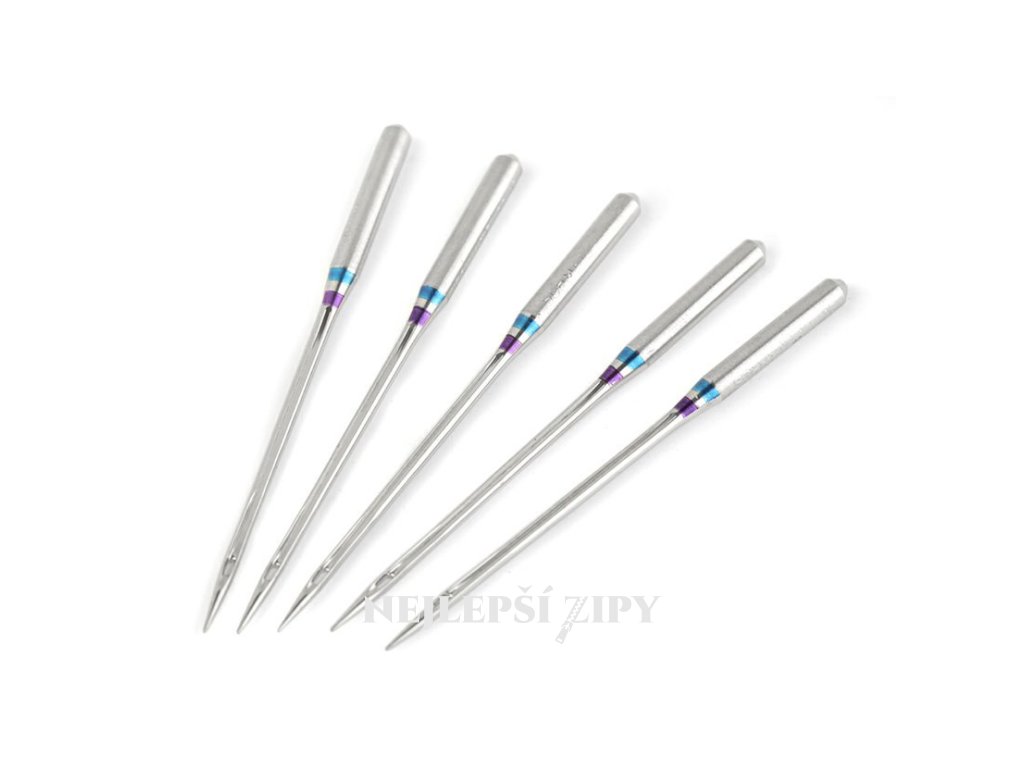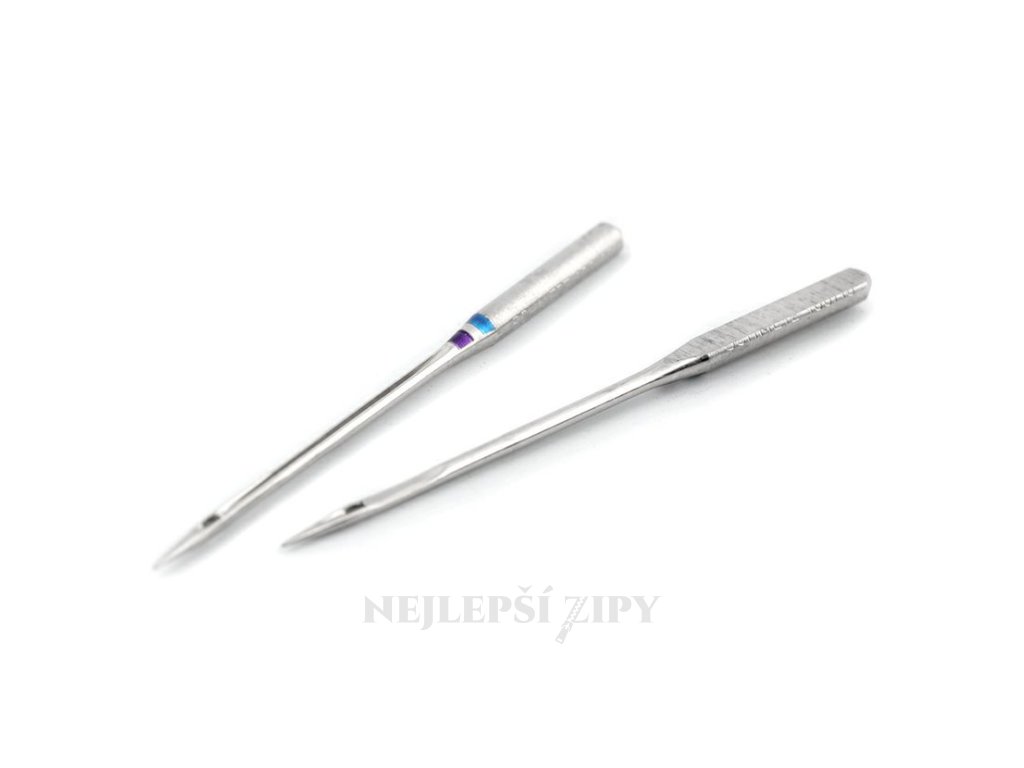 Strojová jehla s ploškou na dříku pro domácí šicí stroje určená na riflovinu, manšestr a jiné hutnější materiály. V krabičce je 5 jehel. Vyrobeno v Německu.